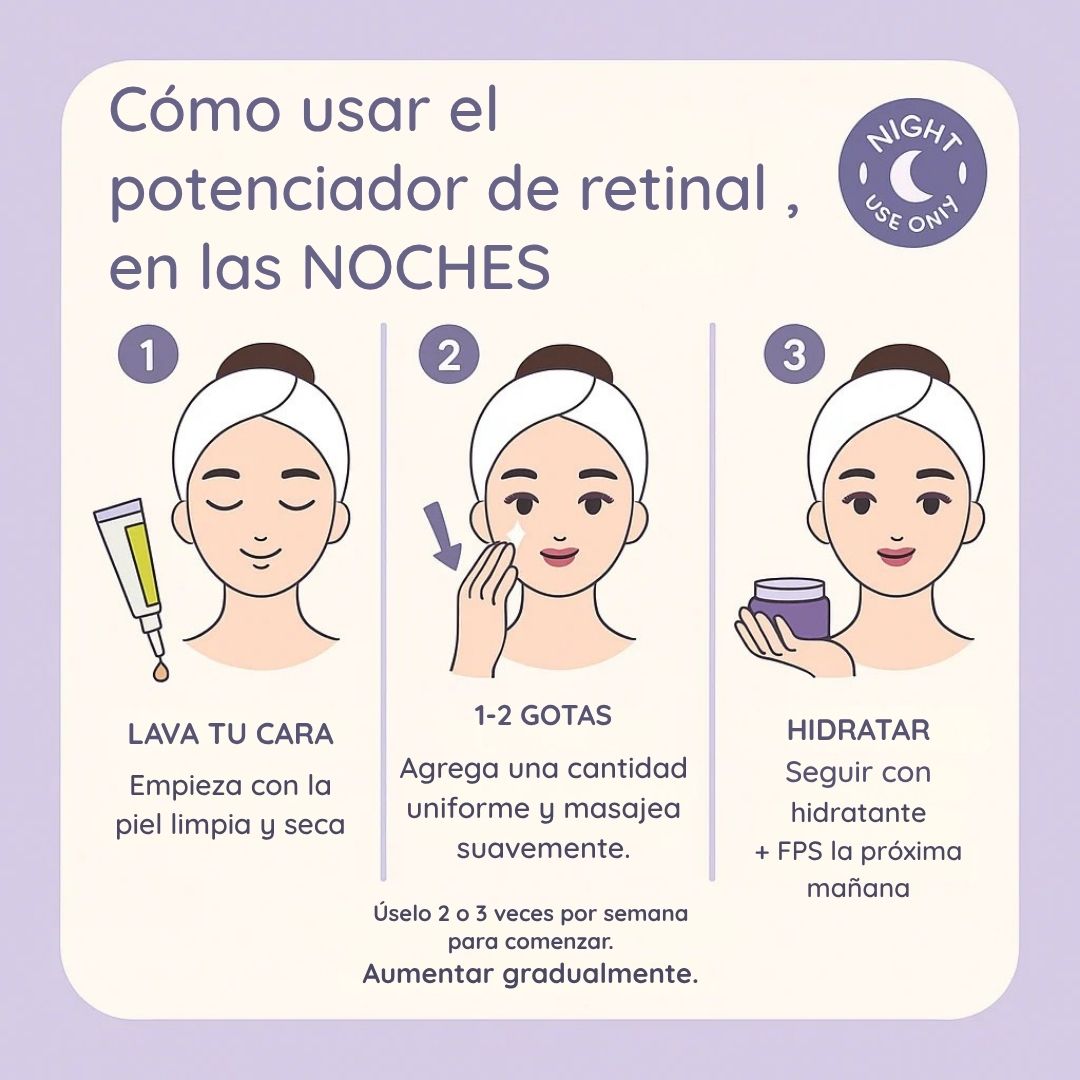 Se recomienda comenzar aplicándolo 2 o 3 veces por semana en la noche, y aumentar la frecuencia de uso gradualmente según la tolerancia de tu piel.