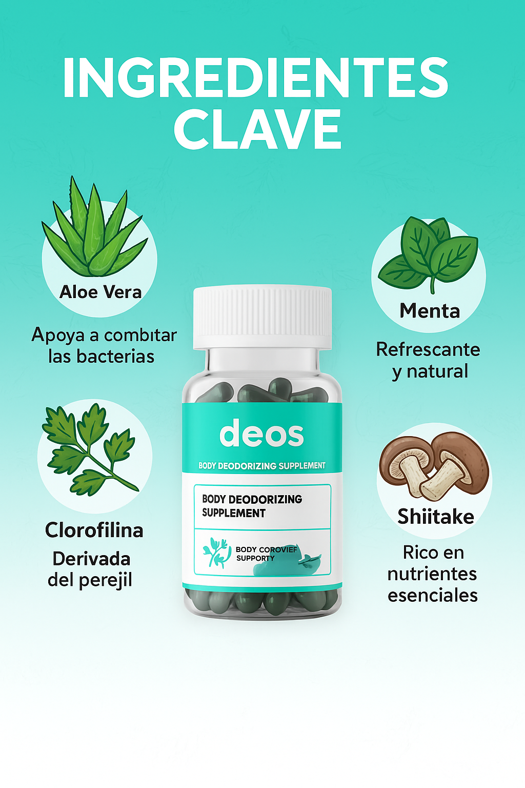 Deos™ es un suplemento alimenticio formulado con ingredientes de origen natural, cuyo objetivo es apoyar el bienestar general y complementar la rutina de cuidado personal. Su función principal es ayudar a mantener una sensación de frescura corporal desde el interior, como parte de un estilo de vida saludable.